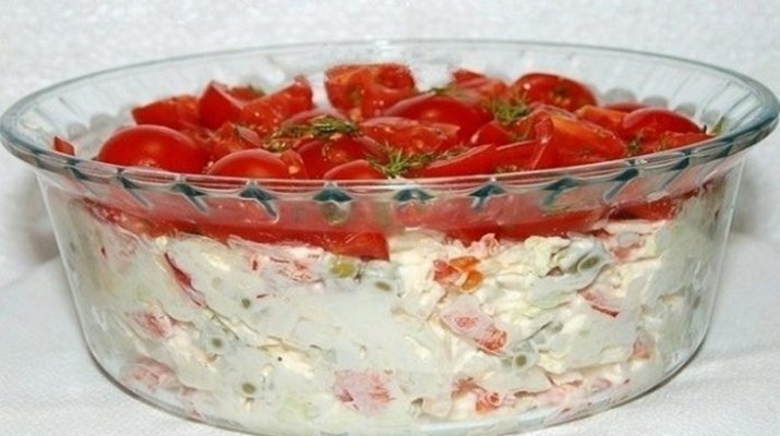 - Додати дрібно нарізаний кріп і сіль. Помідори перемішати і викласти ними верхній шар салату – це буде нашою «Червоною шапочкою».